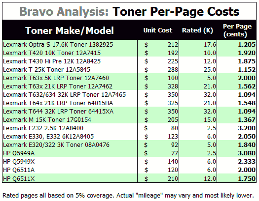 figures, comparing Lexmark Optra T series 21K hi-yield vs 32K
