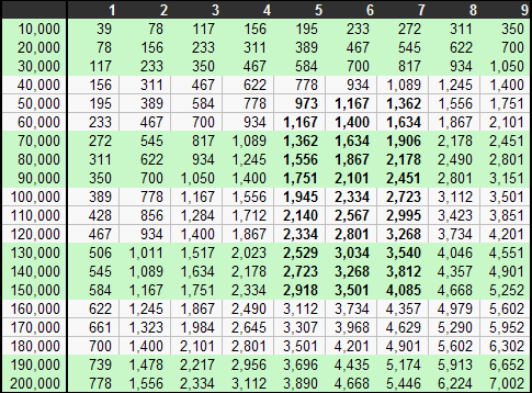 Row = annual volume (pages), Column = life of printer (years)